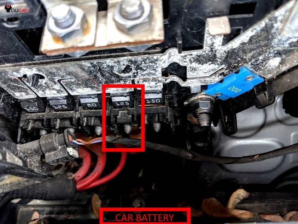 Предохранитель на 125 А питает двигатель гидроусилителя рулевого управления. Этот предохранитель может перегореть, отключив усилитель рулевого управления с усилителем.