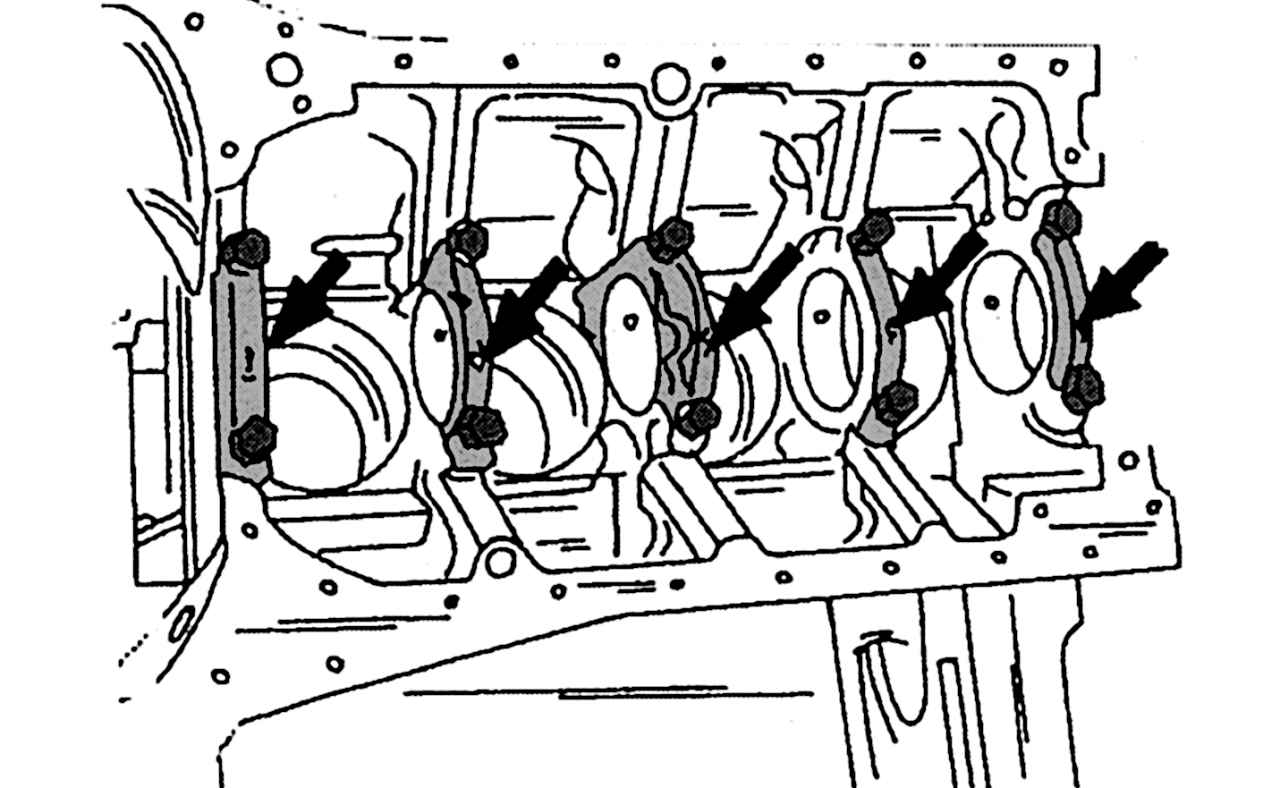 — равномерно, крест-накрест отвернуть болты крепления и снять крышки подшипников коленчатого вала. Убедитесь в том, что номера крышек подшипников хорошо просматриваются. Они имеют порядковую цифровую маркировку от 1 до 5. Крышка № 1 находится со стороны ременного шкива. Маркировка нанесена в средней части крышек подшипников (