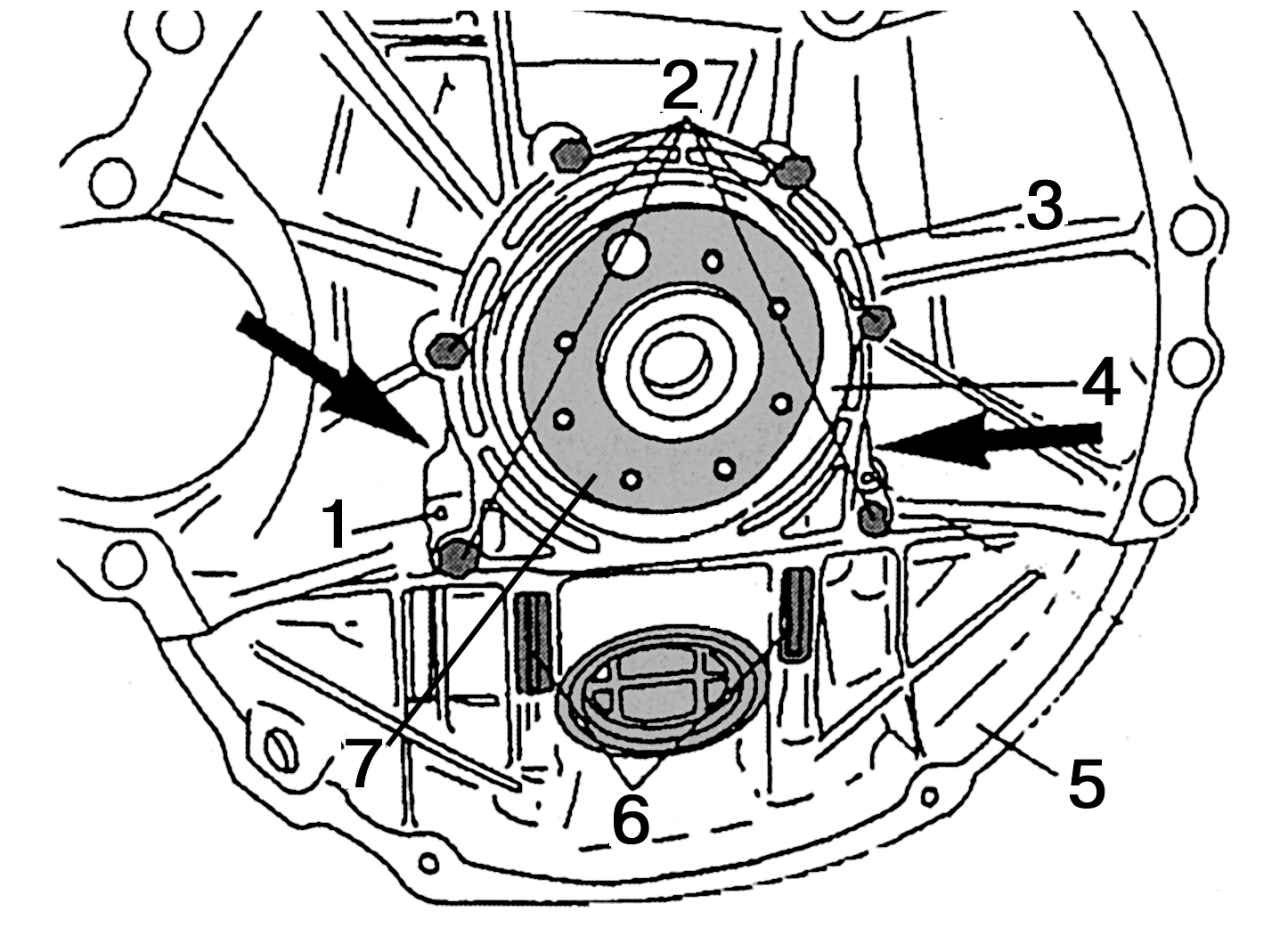 Рис. 74. Задняя часть картера двигателя: 1 — штифт натяжения пружины; 2 — болты М6х22 мм крепления держателя задней манжеты коленчатого вала; 3 — держатель задней манжеты коленчатого вала; 4 — задняя манжета коленчатого вала; 5 — масляный поддон; 6 — болт М6х85 мм; 7 — задний фланец коленчатого вала |
