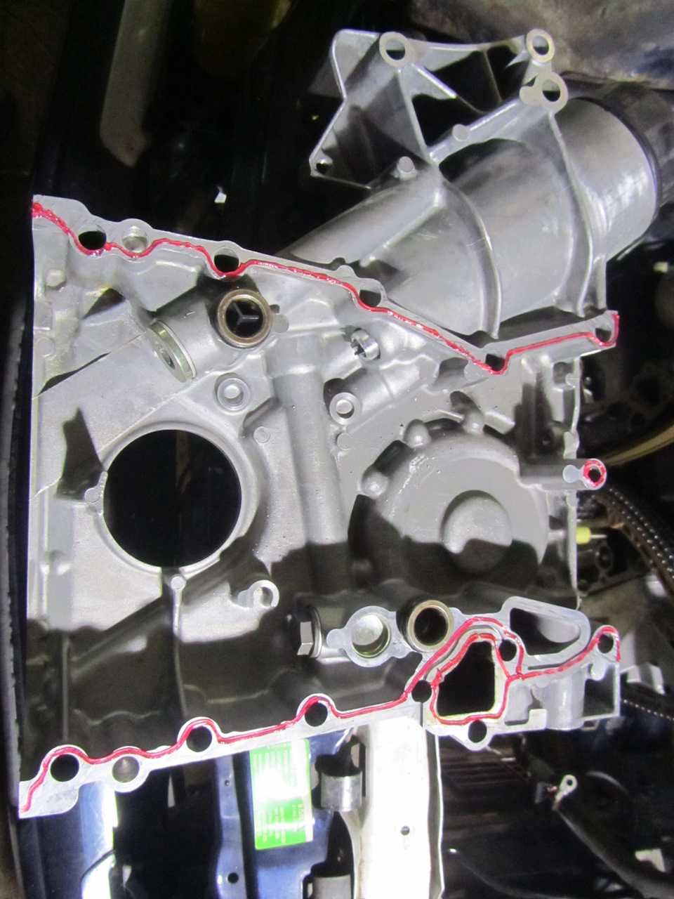 Не забудьте нанести герметик на выступ справа-повередине, через который проходит болт помпы, иначе через это отверстие будет сопливить масло.Важно! Внимательно осмотрите и удалите старый герметик, он хорошо будет виден после обезжиривателя как белый налет. Так как анаэробному герметику нужно соединение с металлом для полимеризации