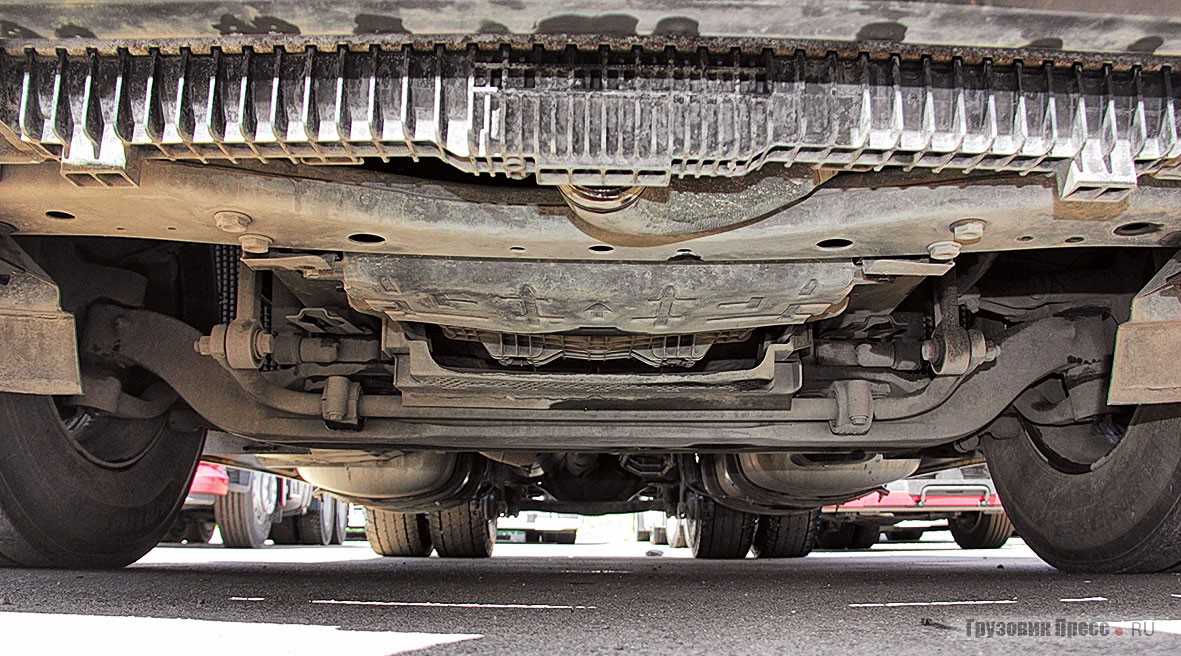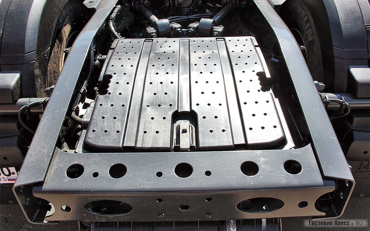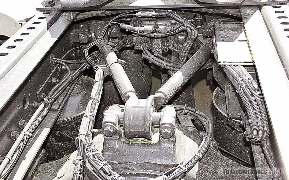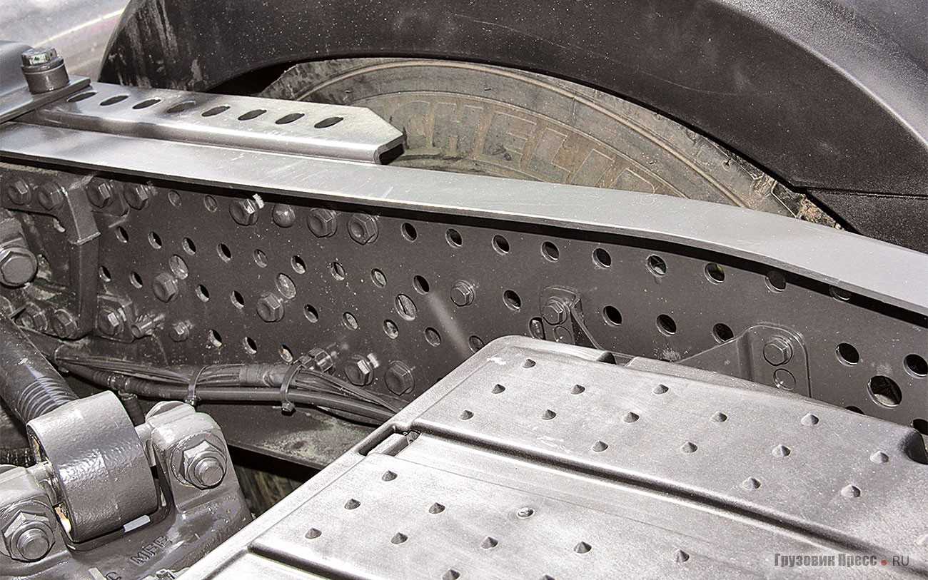 В этой группе деталировки у ориентированного на наш рынок Mercedes-Benz Actros MP4, пожалуй, минимум отличий от европейских спецификаций. Рама, собранная на болтах, изготовлена из высокопрочной стали и испещрена перфорацией. Так удобнее и производителю компоновать великое множество конфигураций оборудования, и потенциальным надстройщикам. Толщина лонжерона рамы снизилась до 6 мм по сравнению с предыдущей моделью, где было 8 мм, высота лонжеронов – 275 мм, а ширина «лестницы» рамы стала больше на 100 мм, увеличив её жёсткость на кручение.