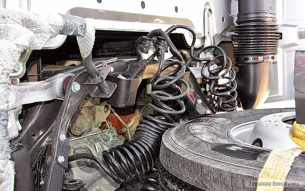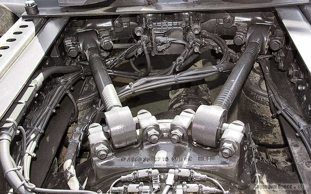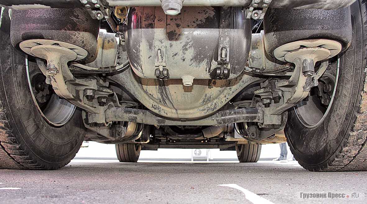Упругие элементы передней оси «русского» четвёртого «Актроса» – двухлистовые рессоры, но сзади пневмобаллоны по четырёхточечной схеме – надёжно, но немного утяжеляет машину в сравнении с двухбаллонной пневмоподвеской, которая применялась массово на МР3.