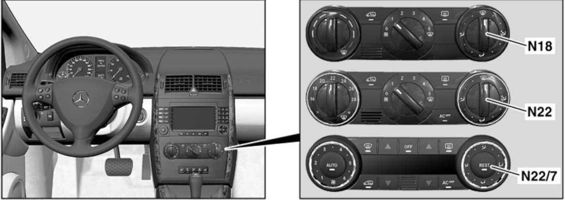 Для выше названных стран на типе 169 серийно устанавливается климатическая система (N22). Для остальных стран в качестве серийного оснащения остается автоматическая система отопления. В качестве дополнительного оснащения можно заказать комфортную климатическую систему (N22/7), (Код 581) (Thermotronic). Блок управления кондиционером, как обычно, расположен в нижней части центральной консоли. Все три системы оснащаются комбинированным пылевым фильтром. Если установлена комфортная климатическая система, то дополнительно кондиционируется воздух в вещевом ящике.