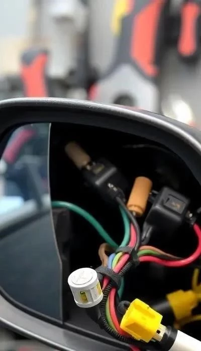 Обрыв проводки в двери или самом зеркале, а также неисправность моторчика, отвечающего за регулировку и складывание зеркала, – частые проблемы, особенно в автомобилях с большим пробегом. При обрыве проводки зеркало может перестать регулироваться, складываться или вообще не реагировать на команды. Неисправный моторчик может издавать посторонние звуки или работать рывками. Важно аккуратно отсоединить провода на зеркале и приводе, используя клипсу, которая является разборной. Аккуратно сдвигается серый крепёж на зелёной клипсе, открывается внутренний вид клипсы, и с помощью острого шила освобождается каждый провод.