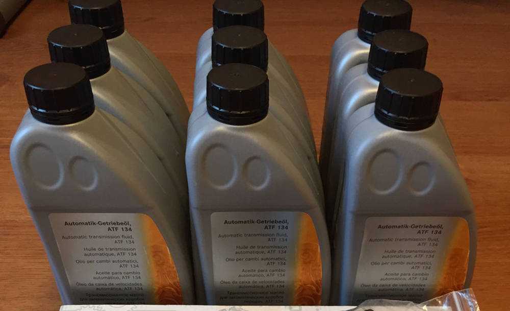 После того как установлено, что АКПП автомобиля нуждается в срочной замене масла, не отодвигайте в «долгий ящик» этот процесс. Лучше сразу посетите автомагазин, чтобы приобрести подходящее масло в коробку Мерседеса W204. Автопроизводитель разрешает использовать две разновидности трансмиссионной жидкости с маркировкой ATF 134 для АКПП такой марки транспортного средства: