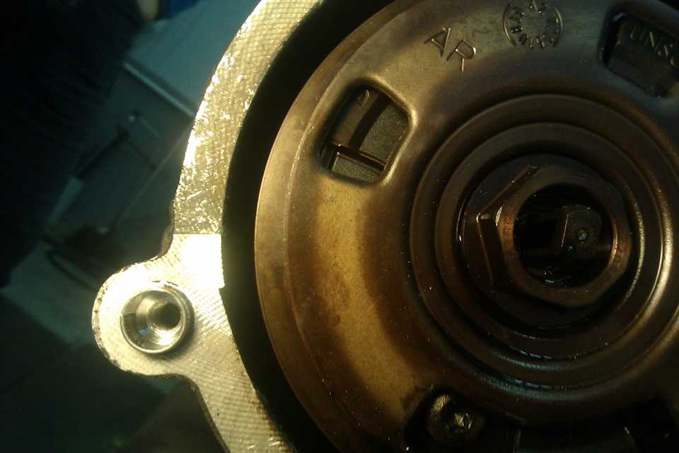 Устанавливается штифт 3мм (подходит, который идет в комплекте с натяжителем ремня) в отверстие для фиксации выпускного фазовращателя.Снимается выпускная шестерня. На привалочной плоскости маленькой крышки шестерен есть отверстие, в нем виден штифт с внутренней резьбой — это направляющая лыжи натяжителя, закручивается болт и направляющая вытаскивается действием, похожим на действие обратного молотка.Лыжа пусть падает вниз.