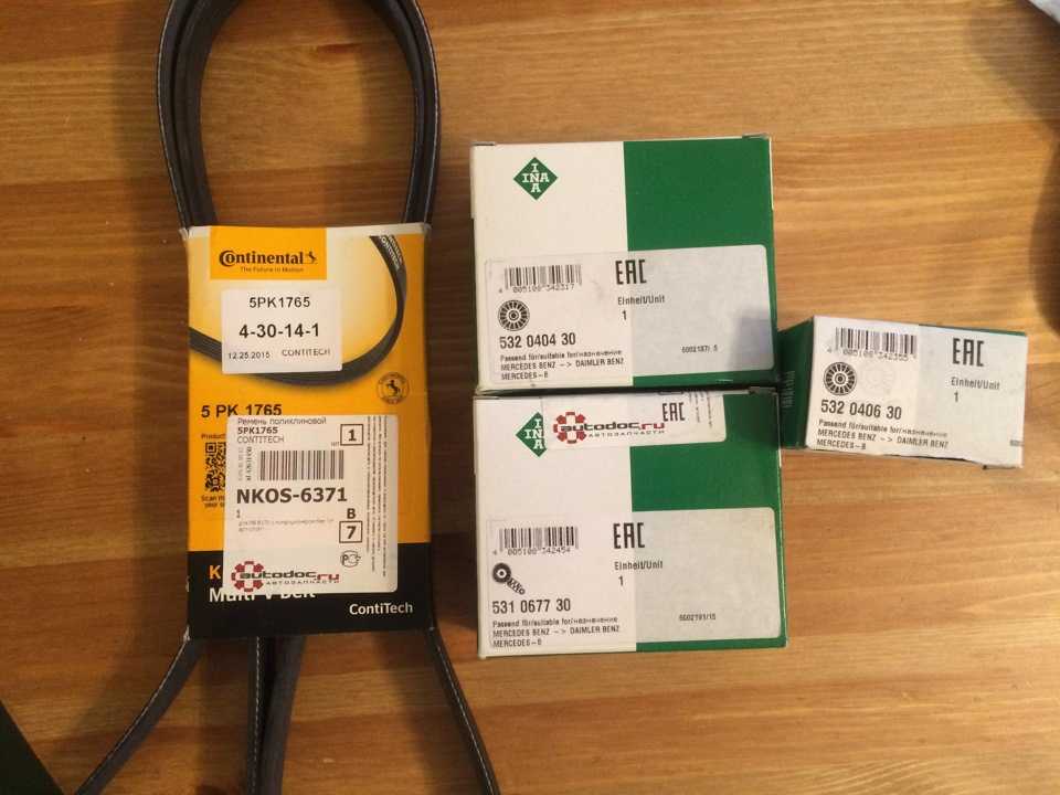 Всем доброго времени суток. На днях заменил все ролики на ремнях, два ремня и кронштейн на котором сидит вискомуфта вентилятора. Началось с того, что в Краснодаре загремел натяжной ролик, да, вот так взял и загремел, до этого ни каких признаков его кончины не было. Я уже подумал, что прийдется там и ремонтироваться, но на то он и Мерседес, чтобы довезти до дома в любом состоянии. Домой добрался нормально. Ремни покупал у себя, причем длинный 7РК2035 нашел легко, а коротыша 6РК691 только в г.Севастополе, за что огромное спасибо Руслану Xpdtr. Паразитные ролики тоже не проблема — купил INA, а вот с натяжным беда, продается он только в сборе с натяжным механизмом, можно и без но в наличии не было ни где. Пришлось подобрать по размеру 65*30*17. За кронштейн крепления муфты спасибо Игорю Merci639, да и вообще Игорю отдельное спасибо за консультации, и запчасти нужно было все купить у него, т.к. в одном месте, оригинал и дешевле с пересылкой, чем купил у себя на месте. Кронштейн усиленный, что не может не радовать. Мои все ролики шумели, в натяжном развалилась обойма, подшипник кронштейна вискомуфты сильно шелестел и имел люфт.