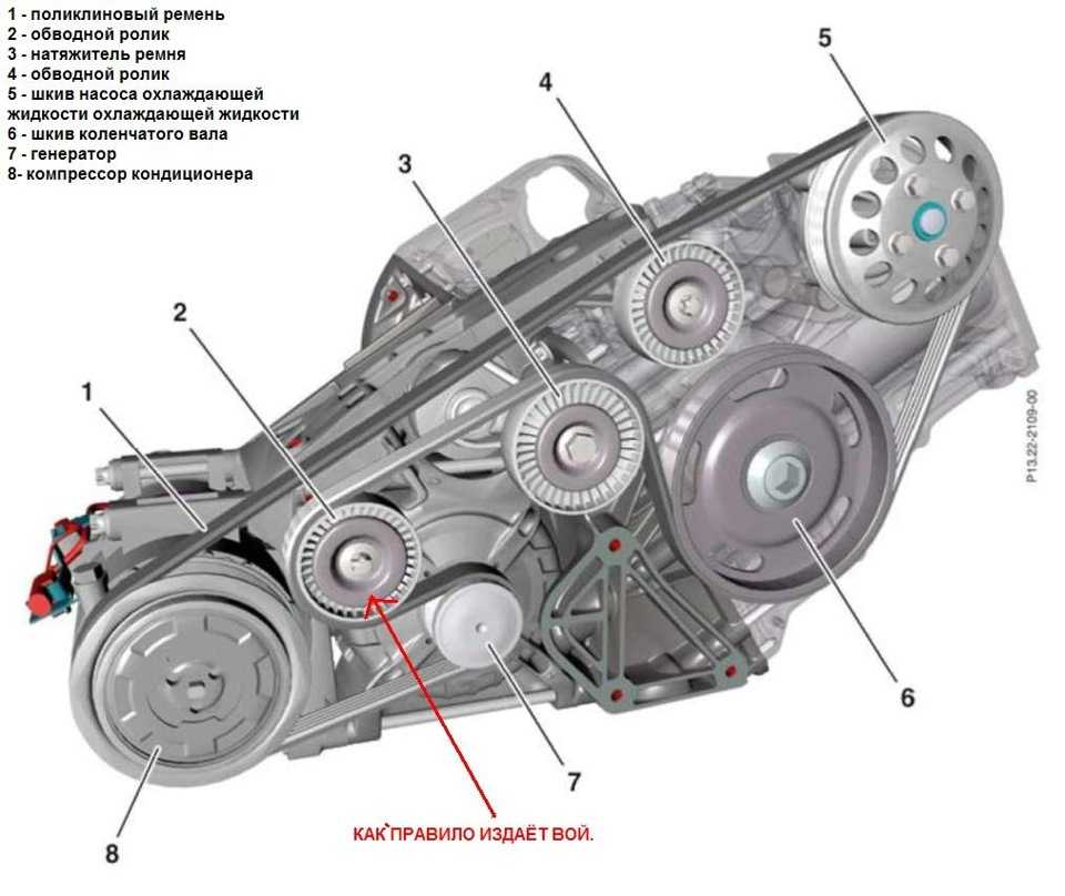 Проверяем работу обгонной муфты генератора и сам генератор на шумы подшипников. Также проверяем обводной ролик, который находится немного выше генератора.