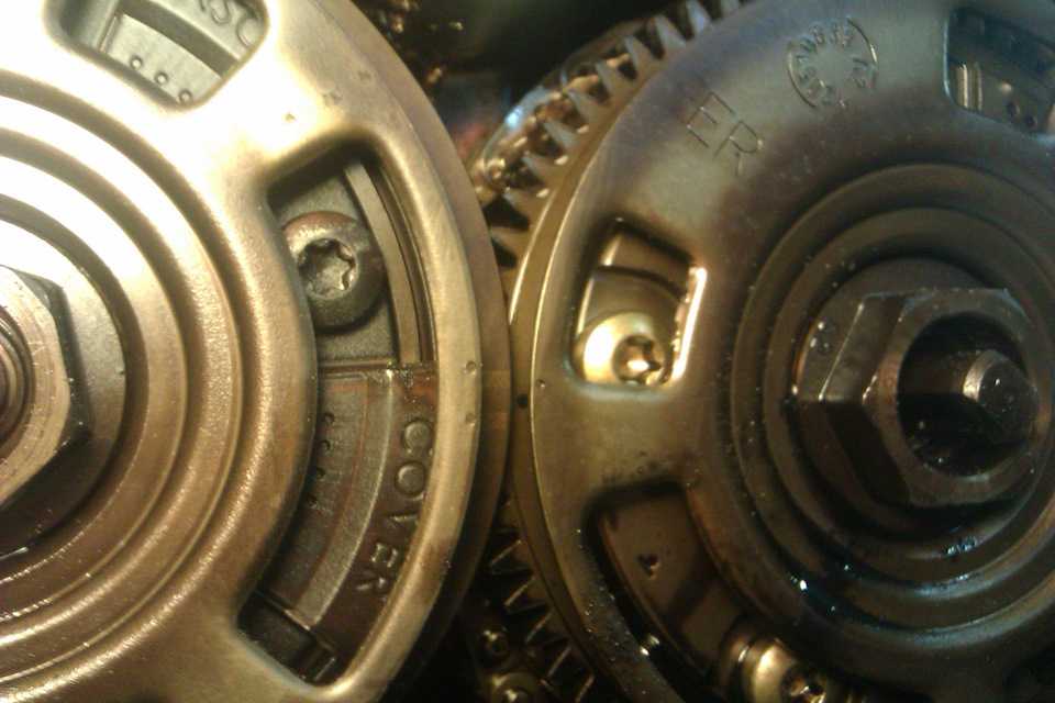 Впускная шестерня тянется на себя — распредвал можно повернуть. Цепь поддевается отверткой, начиная с правого края и отвертка ведется вдоль цепи над шестерней, шестерню можно провернуть на зуб. Цепь переставлена на зуб. Внизу ничего не перескочит.Насчет балансирного вала … тоже не перескочит (что такое балансир — вал с грузиком, если перескочит, максимум получим вибрацию). Также:со слов нашего моториста высочайшего класса: «пока передняя крышка стоит, на балансире ничего не перескочит, так устроена крышка».