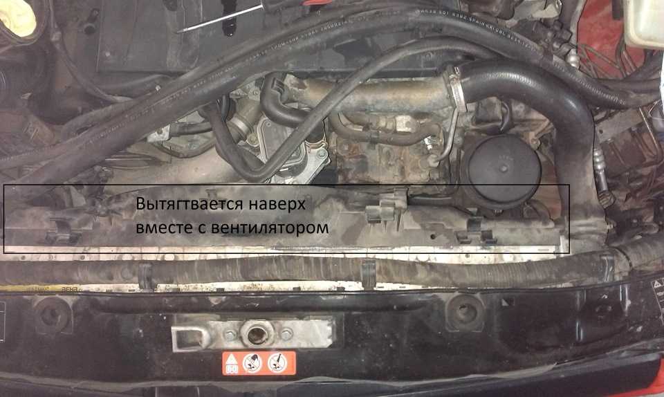 Вот фото процесса с не большим описанием. Все делал без разбора передней части. Кожух вентилятора + вентилятор — одновременно вытаскивается наверх мотора, отдельно снять не получится. Для откручивания муфты нужен съемник, я его сделал из стальной полосы толщиной 3-4 мм. После снятия советую картонкой закрыть соты радиатора, чтобы их не повредить, т.к. остальные работы будут проходить там внутри, места немного.